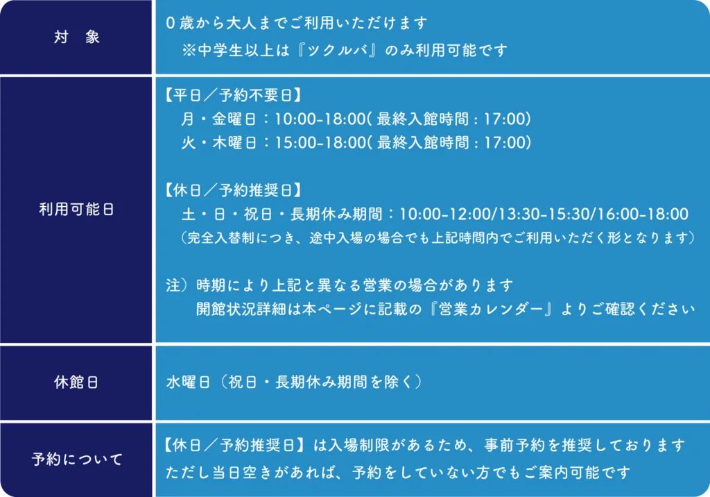 開館日時 平日:9:30~19:00(※冬季間12月~2月は18:00閉館)