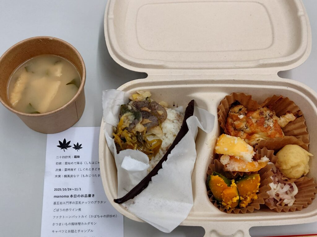 今回は、先輩移住者が営むmanomaからお弁当を注文しました♪山形県内や庄内産の野菜などを使用したランチが魅力で、二十四節気でメニューが変わるというユニークなお店です。Uターンのご主人と、Iターンの奥様で営まれています。