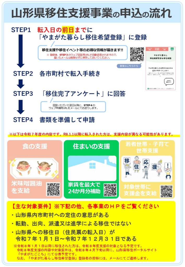 山形県では、食の支援、住まいの支援、などを実施していますが、令和7年1月1日より「やまがた移住登録」に移住(転入)前に登録をしなければ支援を受けられなくなります。