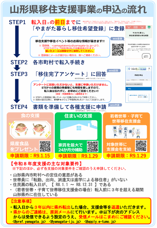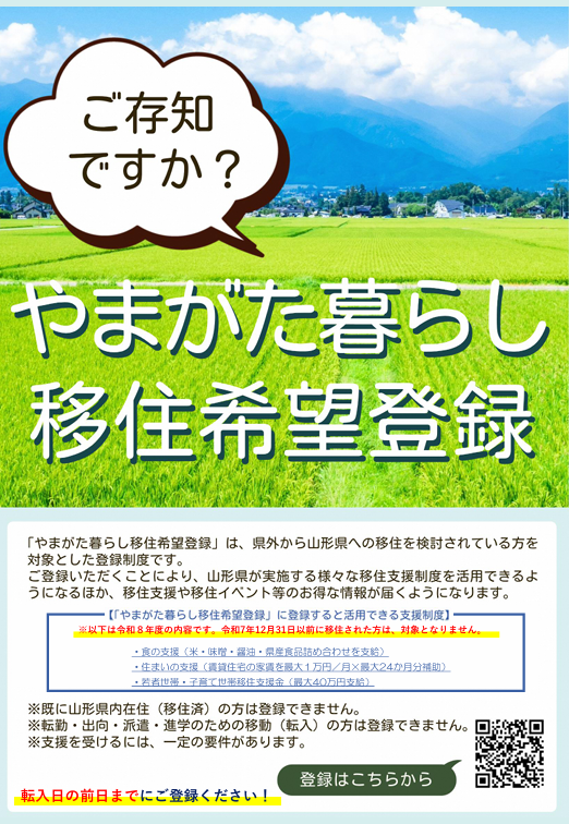 山形県では、食の支援、住まいの支援、などを実施していますが、令和7年1月1日より「やまがた移住登録」に移住(転入)前に登録をしなければ支援を受けられなくなります。