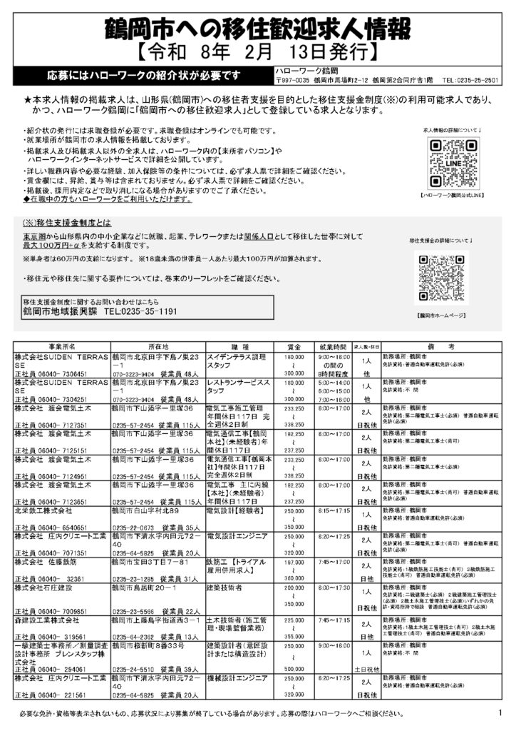 鶴岡市内にある移住支援金対象企業の求人情報を「移住歓迎求人」として、毎月20日頃に求人情報を発刊します。