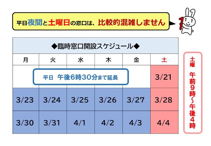 市民課では通常の時間帯に加え、下記スケジュールの期間について窓口を開設します。ただし、取扱い業務が限られておりますのでご注意願います。