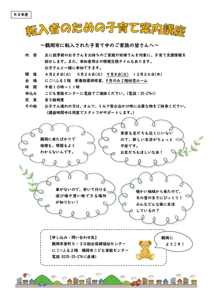 主に就学前のお子さんをお持ちのご家庭や妊婦さんを対象に、鶴岡市の子育て支援情報を紹介します。また、参加者同士の情報交換タイムもあります。お子さんと一緒に参加できますので、お気軽にご参加申し込みください!