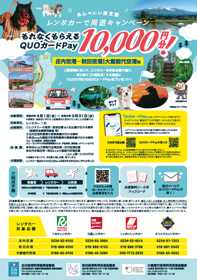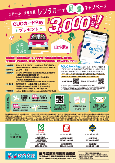 庄内空港発着便を利用し、空港間または、空港⇔駅間をレンタカーで移動する方へ、3つの周遊キャンペーンを実施します。詳しくは、山形県ホームページをご覧ください。