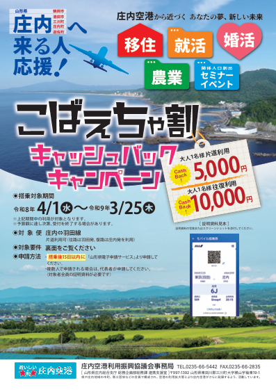 移住、就活、関係人口創出セミナーで庄内空港を利用する方への助成と、レンタカー周遊キャンペーンのお知らせです。